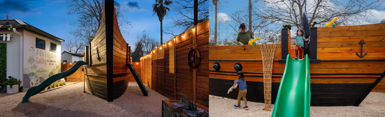 But then the owner had a crazy, genius idea to take it to the next level and turn it into a truly family-friendly stay. No, not a typical kids' play area. They asked the Funkit team to build a pirate ship play structure.
