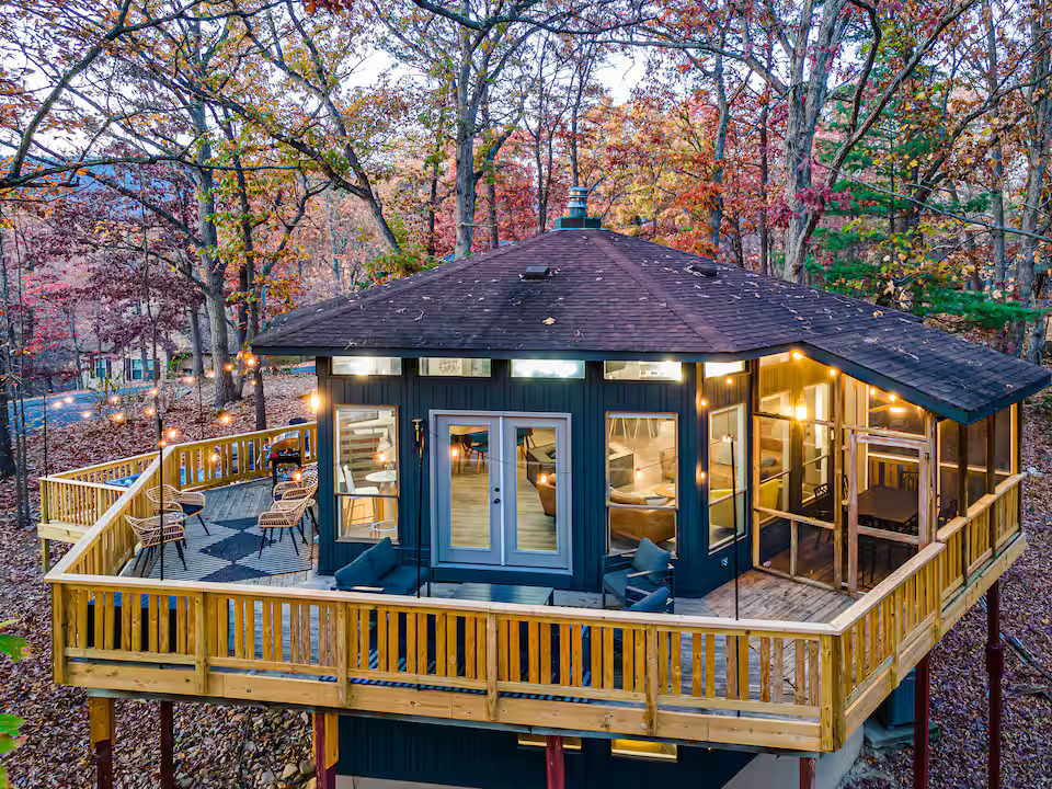 Located in the heart of Massanutten, this 4-bedroom treetop hexagon cabin blends traditional woodland charm with bold design.