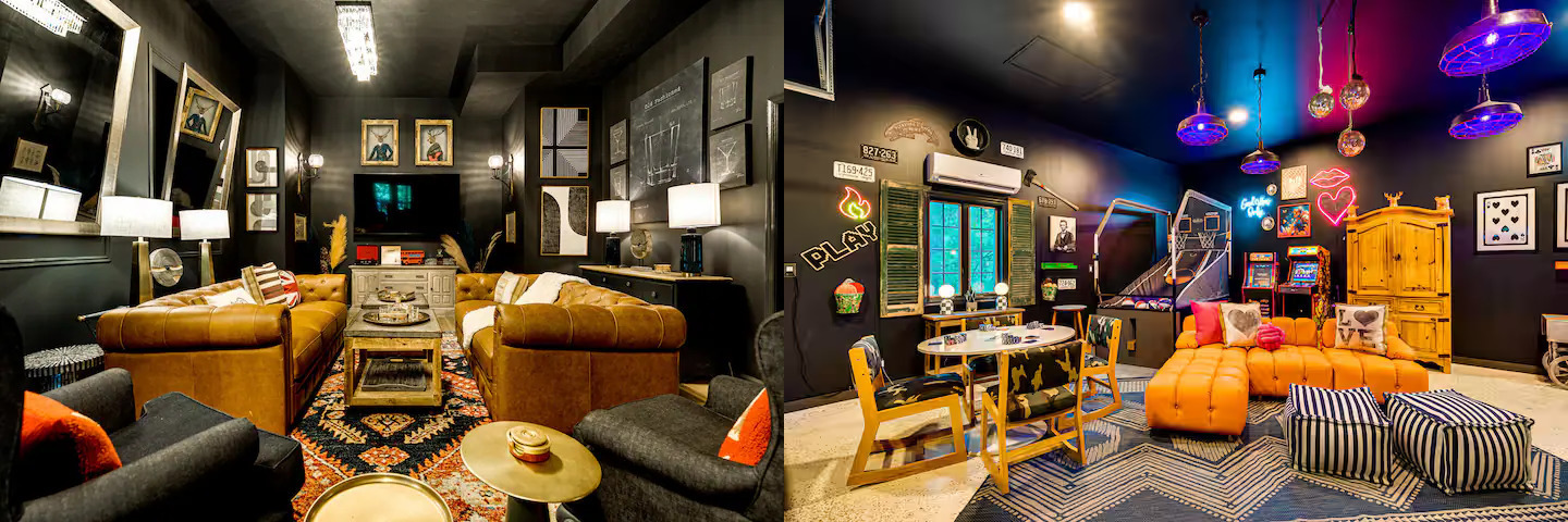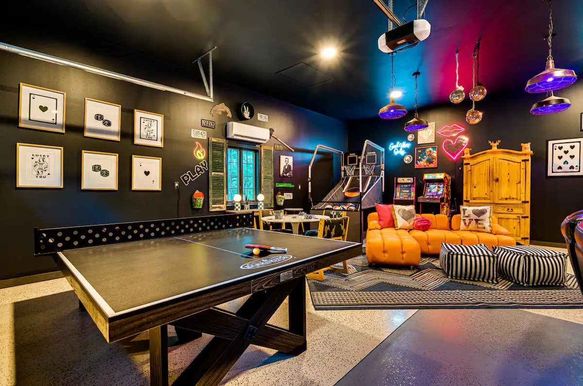 - Retro arcade game cave (Ms. Pac-Man, Street Fighter, arcade basketball)
