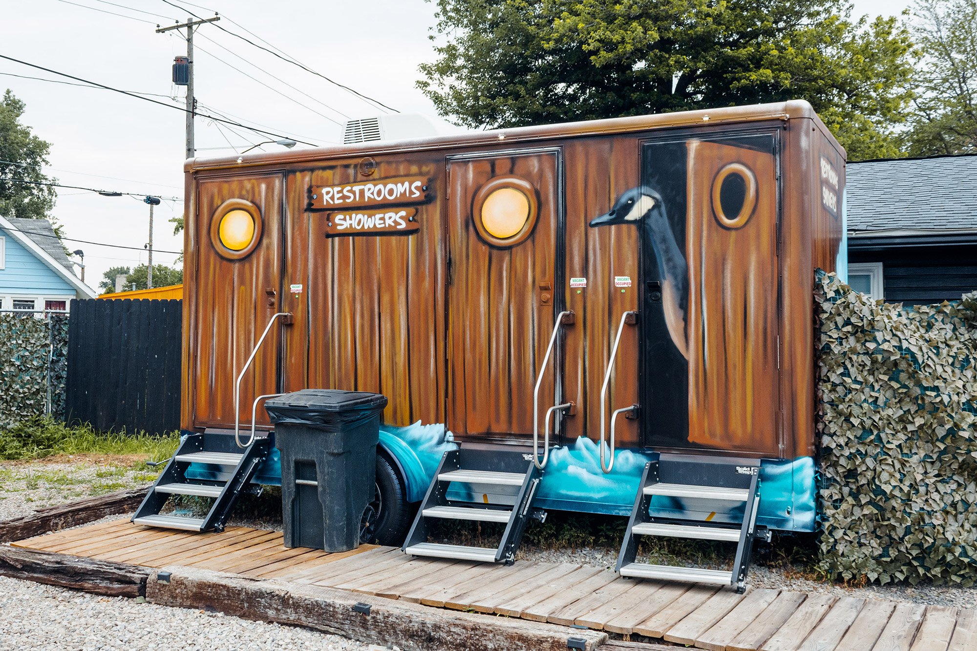 No bathrooms in the units. Just a modular restroom trailer outside. Joe had a graffiti artist transform it into something that looked like a log cabin complete with a goose sticking its head out of the corner.