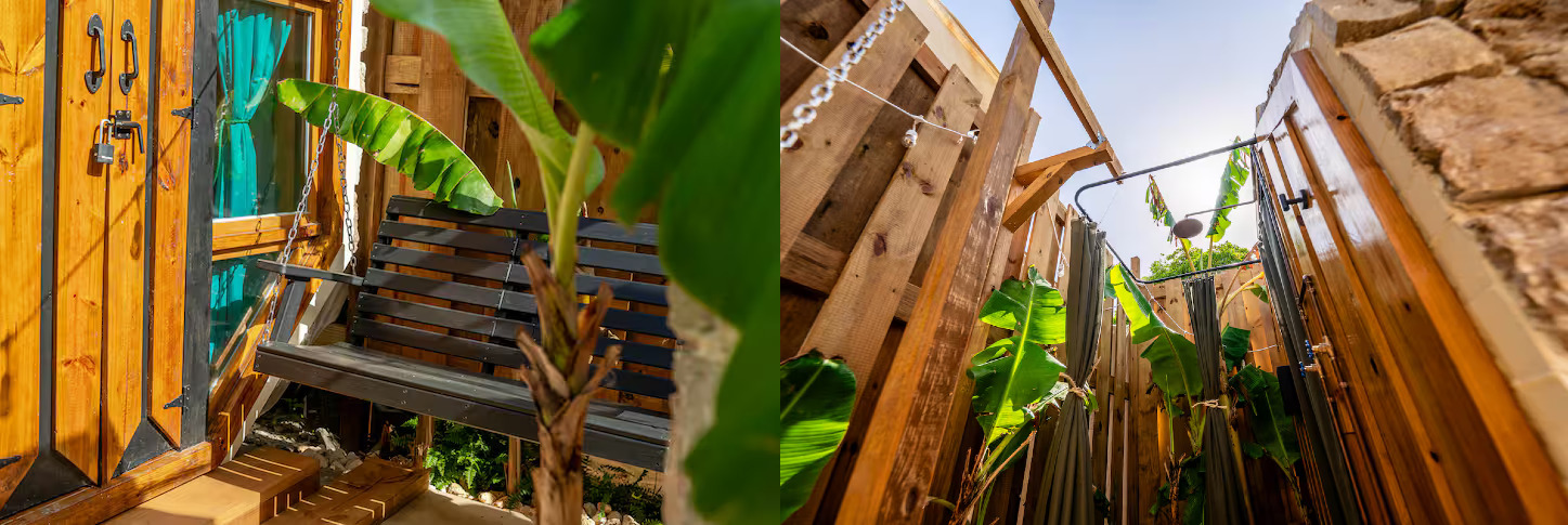 Outdoor bathrooms mean plumbing issues don't require tearing into drywall. Stone tiles and rustic wood mean scuffs and chips become part of the aesthetic instead of damage.