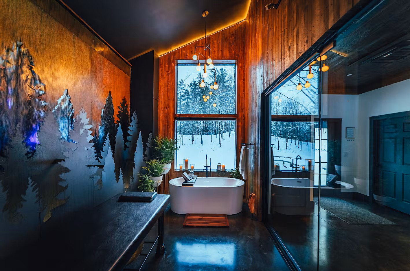 A secluded forest cabin that's all about romance and deep relaxation. It features a private spa room with an indoor waterfall, soaker tub, and massage space.