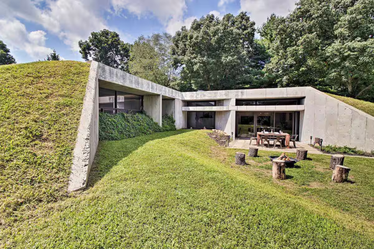 Buried underground with mid-century modern interiors. Guests rave about the comfortable beds and how fun it is to explore the architecture.
