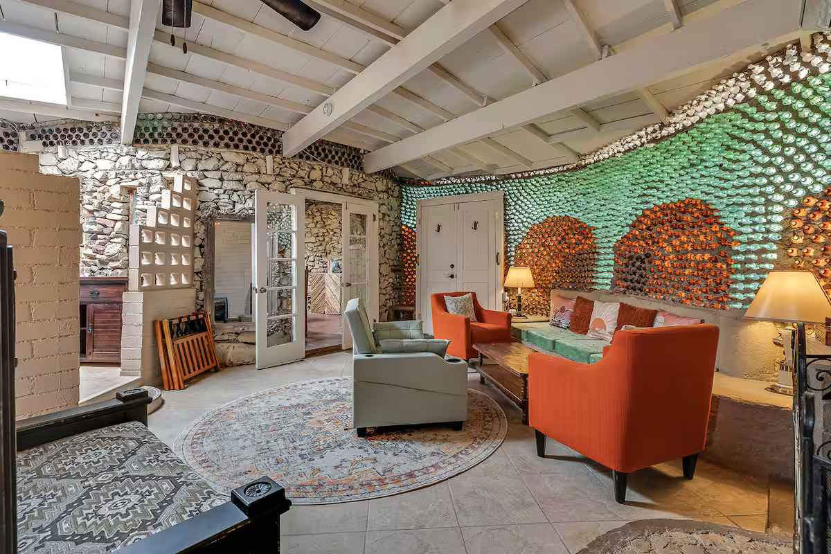 Walls made of thousands of glass bottles and rocks. Light pours through in colors you've never seen indoors. This home is the definition of quirky, but it's still cozy and comfortable.